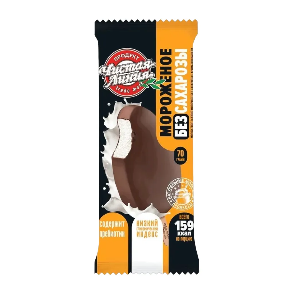 Мороженое Чистая линия Эскимо с ароматом ванили в шоколадной глазури без сахарозы 70г