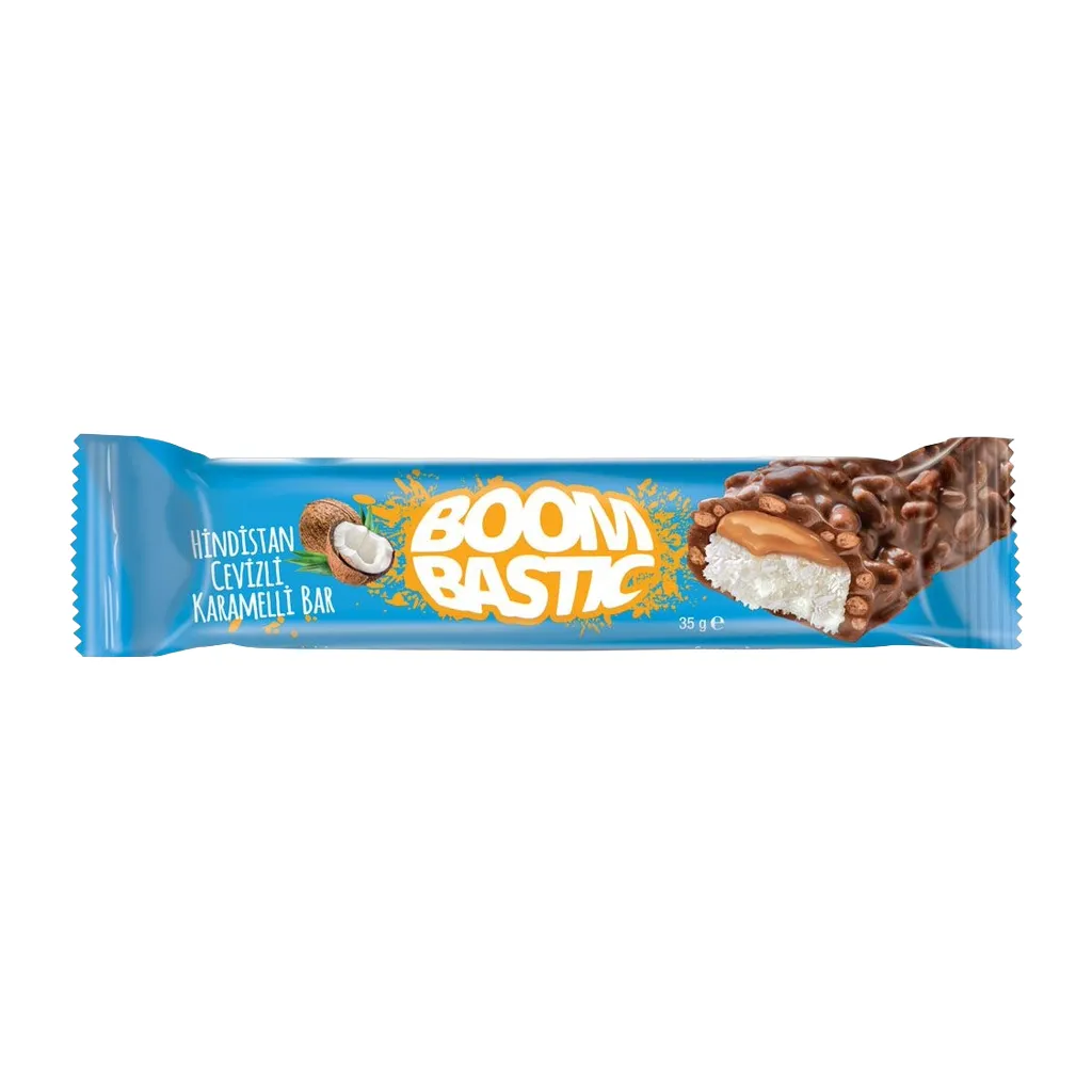 Шоколадный батончик Boombastic COCONUT - прекрасно подойдет для чаепития дома, в приятной обстановке и в кругу друзей. Состав: Молочный шоколад (36%) покрытый кокосовым Батончиком (%40) С карамелью (17%) и хрустящим рисом (7%) Кокосовая начинка (40%)((Кокос (41%), глюкозный сироп, сахар, увлажнитель глицерин, соль, эмульгатор соевый лецитин, сахар, сухое цельное молоко, сухая молочная сыворотка, увлажнитель (глицерин), соль, эмульгатор соевый лецитин), натуральный краситель карамель, ароматизатор (ванилин), хрустящий рис (7%) (пшеничная манная крупа, рисовая мука, сахар, какао - порошок, соль, разрыхлитель (бикарбонат натрия), эмульгатор соевый лецитин).