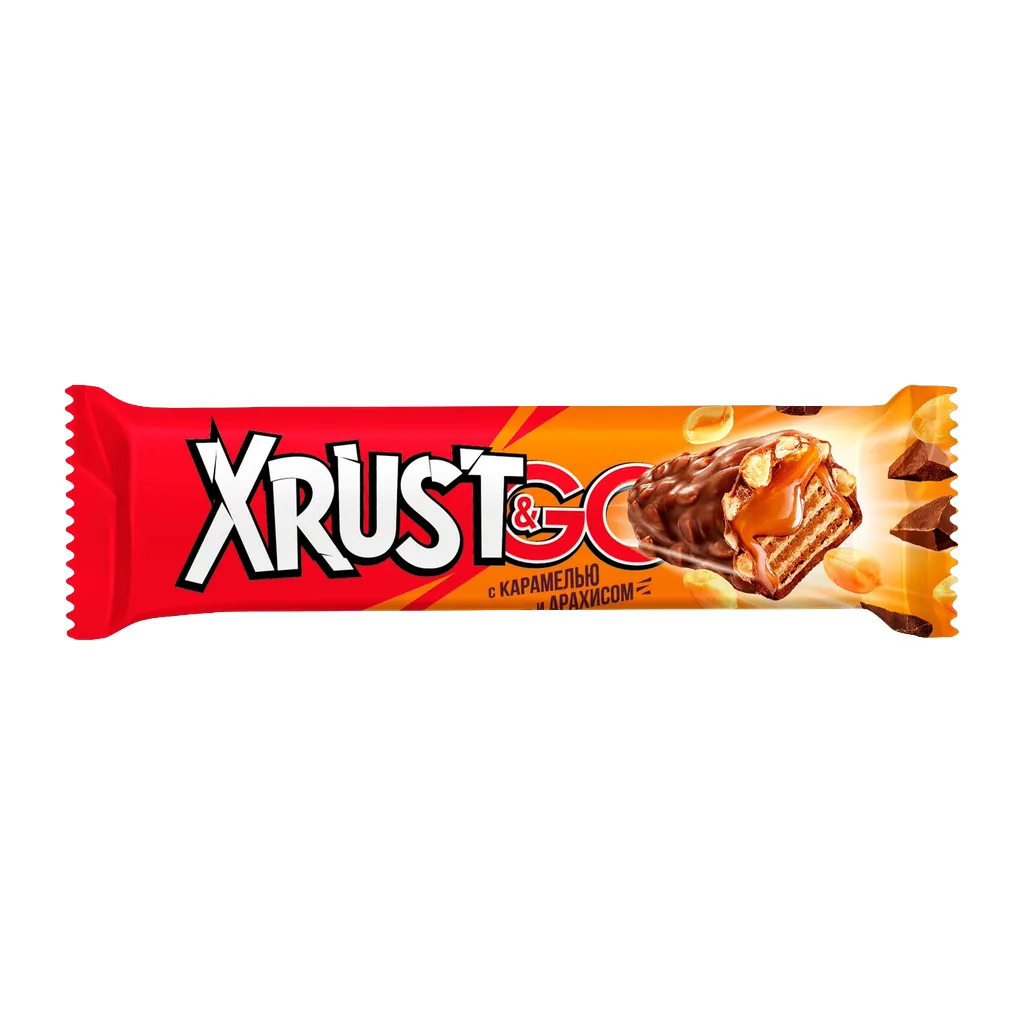 Вафельный батончикXrust&Go с арахисом и карамелью - это сочетание хрустящих вафель, мягкой карамели из цельного сгущённого молока, дробленного арахиса и настоящего молочного шоколада.