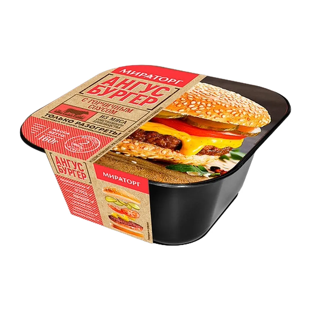 Ангус Бургер Мираторг с горчичным соусом замороженный 160 г зарядит энергией и поднимет настроение своим ярким сбалансированным вкусом. Блюдо готово к употреблению — перед подачей к столу его следует лишь разогреть любым удобным способом (в микроволновой печи или духовом шкафу), для чего предусмотрен удобный контейнер. Горячее бургер вызывает аппетит одним своим видом и манящим ароматом. Между слоями румяной булочки расположены ломтики маринованных огурчиков, сыр и сочная котлета, пропитанная пряным горчичным соусом. Такое сочетание обеспечивает вкусовое удовольствие, которое хочется продлить как можно дольше. Котлета в начинке изготовлена из мраморной говядины Мираторг. Мясо молодых бычков содержит прослойки жира, которые плавятся во время термообработки и пропитывают блюдо ароматным соком, что является важной основой правильного закрытого бутерброда. Мираторг — ведущий производитель и поставщик мяса на российском рынке. Компания заботится об окружающей среде, соблюдает стандарты биологической безопасности и придерживается принципов этического ведения бизнеса. Экологичность и натуральность продукта остаются одними из очевидных конкурентных преимуществ Мираторга. Компания выращивает животных без применения антибиотиков и гормонов роста, продукция Мираторга не содержит ГМО.