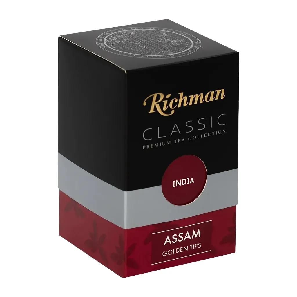 Чёрный крупнолистовой чай Richman Assam произрастает на севере одноимённой провинции в Индии. Климатические условия этих мест создают особый парниковый эффект, который благоприятно сказывается на чайных листочках. Индийский ассам — бодрящий напиток насыщенного янтарно-красного цвета, обладающий характерным солодовым послевкусием. Англичане, известные ценители чая, предпочитают выпивать чашку крепкого ассама на завтрак.