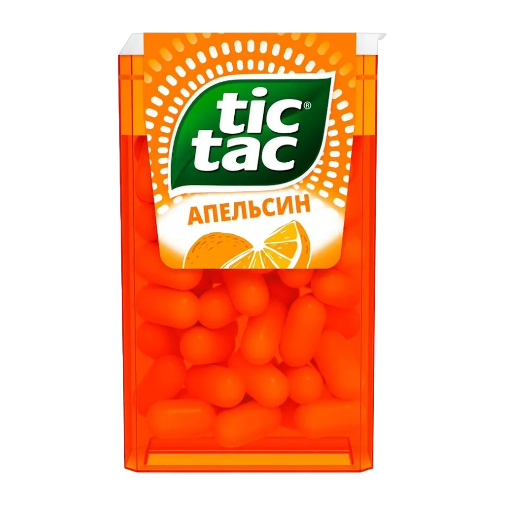 Tic Tac — освежающие драже для мягкого освежения. В каждом драже более 100 слоёв уникального вкуса. Классический вкус апельсина от бренда Tic Tac – яркий цитрус с мягким освежением. Большой формат упаковки для работы, дома и машины. Наполни свой день приятными моментами вместе с Tic Tac!