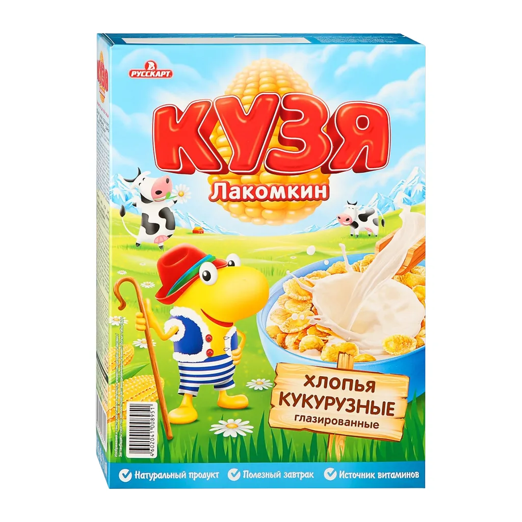Кукурузные хлопья. Кукурузные хлопья Кузя Лакомкин прекрасно подходят для завтрака и сочетаются с молоком, кефиром или йогуртом! Хлопья равномерно покрыты тонким слоем сахарной глазури, поэтому они не размокают в молоке и остаются хрустящими и аппетитными. Продукт не содержит ГМО. Завтраки Кузя Лакомкин готовятся быстро и настолько просто, что справится даже ребенок!