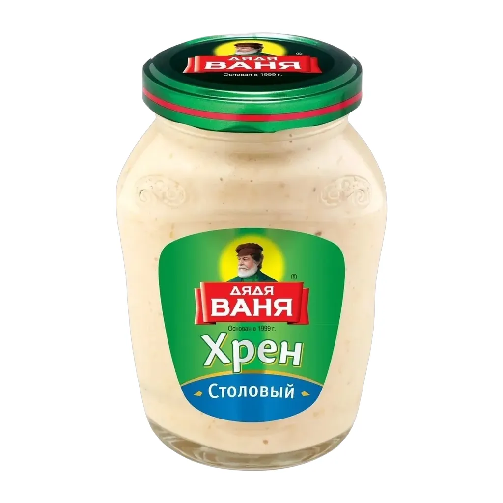 Хрен «Дядя Ваня» – любимый соус в зимнее время года на каждом столе. Свежий протертый хрен обладает пряным и терпким ароматом. Добавьте его в обычное блюдо, и оно приобретет пикантный вкус. Хрен идеально подходит к блюдам из рыбы и мяса, используется в качестве приправы к овощным блюдам и супам.Хрен столовый «Дядя Ваня» внесет пикантные нотки в любое блюдо. Национальная Русская приправа - это прекрасный способ разнообразить рацион и создать оригинальные кулинарные изыски. Продукт изготовлен из натуральных ингредиентов. Значительная часть его состава - это отборный корень хрена, выращенный в естественных условиях. Приготовлен продукт по старинной русской технологии с добавлением соли и небольшого количества воды. Он в меру густой и очень острый.