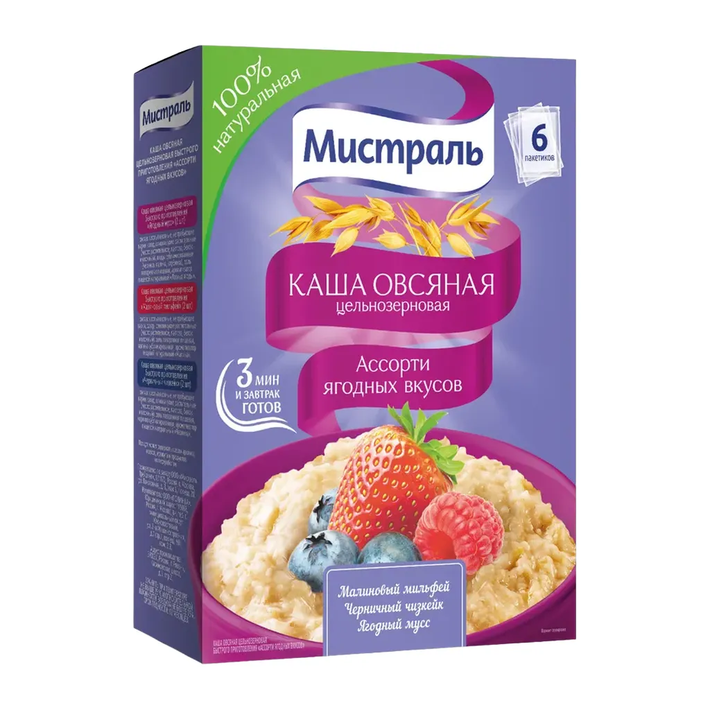Ассорти ягодных вкусов овсяной цельнозерновой каши быстрого приготовления Мистраль. В коробке 3 вкуса по 2 пакетика (всего 6 пакетиков): Черничный чизкейк, Малиновый мильфей, Ягодный мусс. Ароматная каша-десерт - это быстрый, вкусный и полезный завтрак, состоящий из полностью натуральных ингредиентов. Цельные овсяные хлопья подарят энергию и чувство сытости надолго. Способ приготовления: добавьте 150-180мл кипящей воды или молока, перемешайте, закройте крышкой и дайте настояться 3-5 минут. Готовится очень просто и быстро! Состав: хлопья овсяные, сахар, сливки сухие растительные (масло растительное, лактоза, белок молочный), ягоды сублимированные (черника, малина, клубника), соль поваренная пищевая, ароматизатор натуральный "Лесные ягоды".