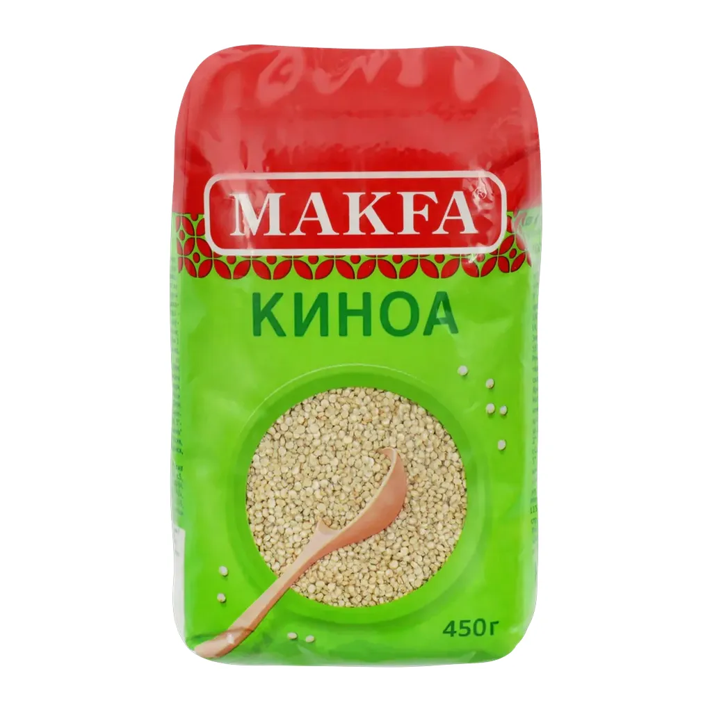 Киноа MAKFA — натуральное зерно светло-бежевого цвета с нейтральным нежным вкусом и рассыпчатой структурой. Особенности: содержит больше белка, чем другие злаки, богата магнием и жирными кислотами, в составе нет глютена, подходит для вегетарианского питания.