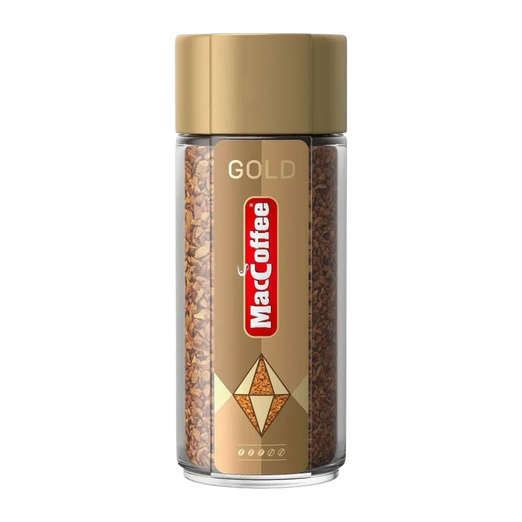 Cублимированный кофе MacCoffee Gold с богатым, насыщенным вкусом и ярким ароматом. Отборные кофейные зёрна обжариваются до характерного золотистого цвета, чтобы полностью раскрыть вкус зерна, сохранив его натуральное богатство и разнообразие оттенков.