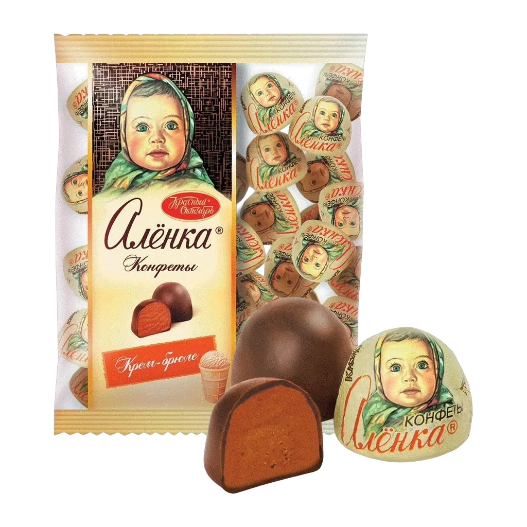 Конфеты Алёнка крем-брюле – маленькие конфеты в форме традиционных кирпичиков с закругленными краями. Нарядные блестящие фантики делают их прекрасным праздничным угощением. Изысканный вкус темной молочно-шоколадной помадки, сливочно-карамельный вкус крем-брюле, тонкая нежная шоколадная глазурь – любимая Алёнка в новом, более утонченном формате.
