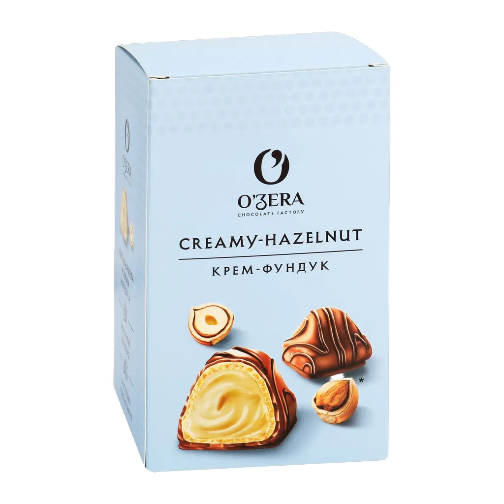 Конфеты вафельные с молочно-ореховой начинкой в молочном шоколаде от бренда O'ZERA – хрустящие пирамидки с молочно-ореховой начинкой, в молочном шоколаде. Паста из отборного лесного ореха. Цельное молоко. 100% молочный шоколад.