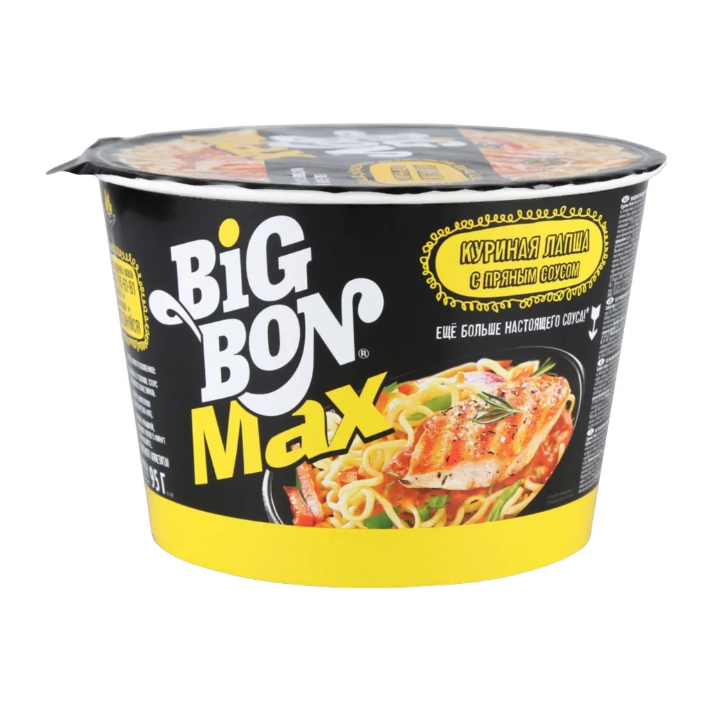Лапша быстрого приготовления BigBon куриная с пряным соусом. Состав: лапша: мука пшеничная высшего сорта, масло растительное, вода, крахмал тапиоковый и кукурузный, соль, загуститель - гуаровая камедь. соус: вода питьевая, масло растительное, соль, сахар, усилитель вкуса и аромата - глутамат натрия, мясо курицы сушеное, овощи сушеные (лук репчатый, чеснок, укроп), специи (перец белый и красный, куркума), регуляторы кислотности (уксусная и молочная кислоты), стабилизатор (гуаровая и ксантановая камеди, яичный желток), консерванты (е202, е211), антиокислитель - е385, ароматизатор (курица), краситель - бета-каротин. сушеные овощи: кукуруза, горох, морковь, соевый текстурат, лук зеленый.