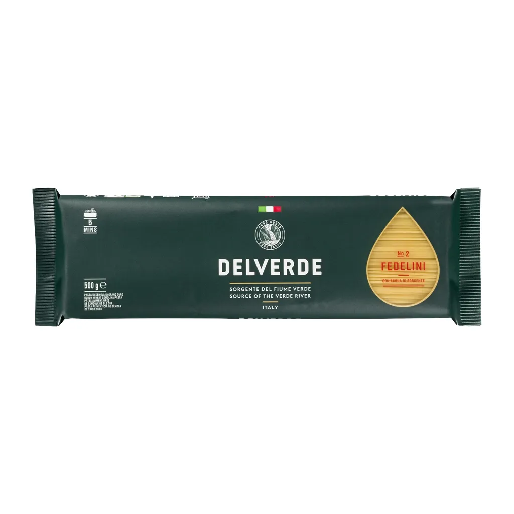 Delverde №002 Феделини, 500 г — настоящая итальянская паста из региона Абруццо, произведённая из отборной пшеницы твёрдых сортов. Благодаря бронзовой пресс форме паста получает лёгкую шероховатость, которая помогает соусу лучше держаться на поверхности. Медленная сушка при низкой температуре сохраняет природный вкус, аромат и идеальную текстуру после варки.Феделини — очень тонкие итальянские спагетти. Отличный выбор для морепродуктов, песто, соуса на основе масла. Паста Delverde — выбор тех, кто ищет настоящую итальянскую пасту премиального качества.
