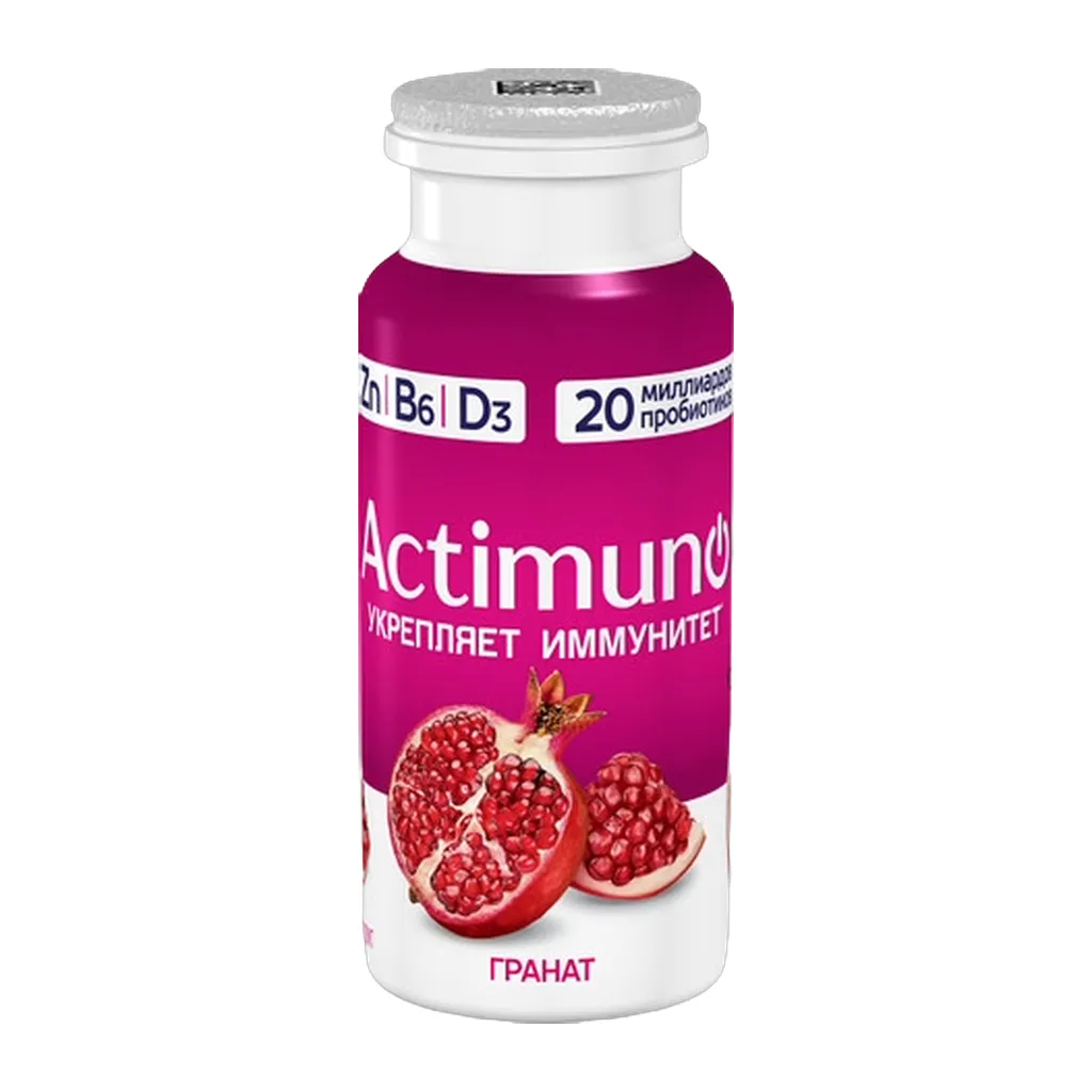 В маленькой бутылочке кисломолочного напитка содержится 20 млрд пробиотиков L.Casei Imunitass. Это молочнокислые культуры, которые способствуют укреплению защитных сил и повышению сопротивляемости инфекциям. В составе напитка также есть витамины B6 и D3, и цинк. Полезный продукт обладает приятным вкусом граната и придётся по душе взрослым и детям. Actimuno — бренд, который предлагает линейку полезных кисломолочных напитков. В их составе есть как стандартные йогуртовые культуры, так и уникальный пробиотик для повышения иммунитета.