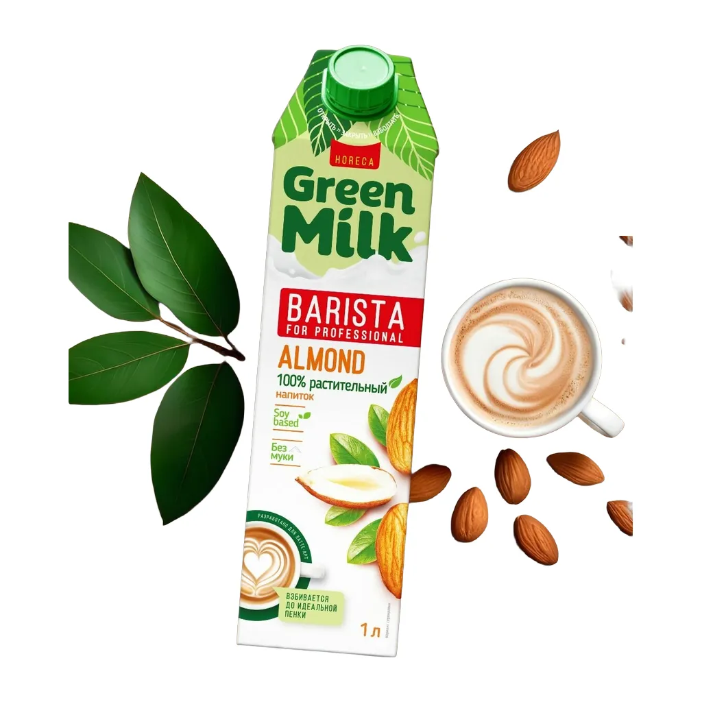 Особенности продукта: Нотка горького миндаля ярко проявляется на фоне вкуса любого кофе; В составе натуральная миндальная паста; Для любителей яркого миндального вкуса и аромата; Green Milk Barista Миндаль разработан в диалоге с бариста - профессионалами в области кофе; Предназначено для рисования latte art; Основа из соевых бобов, а не из муки; Благодаря наличию растительного белка всегда пышная пенка; Имеет нейтральную кислотность (ph=7) – сохраняет вкус кофе