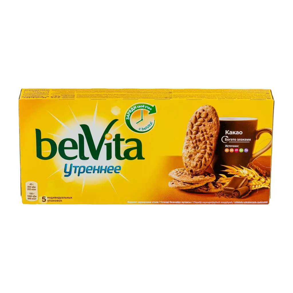 Печенье витаминизированное BELVITA "Утреннее" с какао богато злаками и обогащено витаминно-минеральным комплексом. Идеально подходит для начала дня: дополняет йогурт, творог, каши, фрукты и делает завтрак еще вкуснее и питательнее. Печенье является прекрасной альтернативой круассанам, пряникам, крекерам, кексам, сушкам и другой выпечке; отлично подходит к чаю и к кофе, сочетается с молоком, кефиром, ряженкой, соком, какао и другими напитками. Не содержит продуктов животного происхождения, поэтому подходит для употребления в пост.