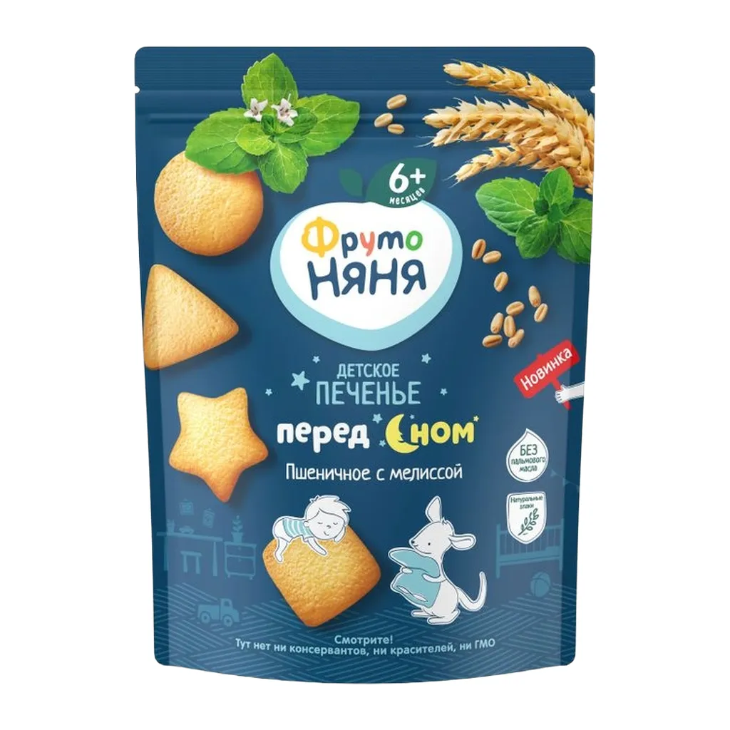 «ФрутоНяня» печенье с мелиссой «Перед сном» подходит для малышей старше 6 месяцев. Злаки в печенье продлят чувство сытости малыша, а натуральный экстракт мелиссы в составе поможет подготовиться ко сну. Упаковка с удобным замочком позволит продлить свежесть и вкусовые качества продукта после открытия.