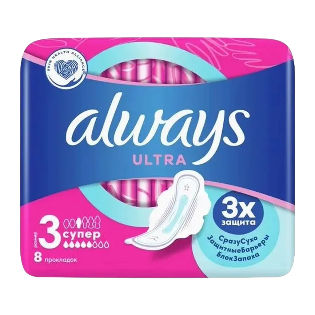 Тройная защита от Always — не соглашайтесь на меньшее: в Always Ultra «Супер» (Размер 3) с крылышками используется новейшая технология для создания многофункциональной гигиенической прокладки с 3 элементами защиты. Система «Сразу сухо» впитывает влагу за считаные секунды и не дает ей соприкасаться с кожей. Технология «Защитные барьеры» удерживает жидкость, предотвращая протекания. Технология «Блок запаха» нейтрализует неприятные запахи, придавая ощущение свежести и чистоты во время менструации. С Always Ultra вы можете чувствовать себя уверенно весь день. Тройная защита от Always — не соглашайтесь на меньшее. Формула дерматологически одобрена Ассоциацией здоровья кожи (Skin Health Alliance). Попробуйте Always Ultra Secure Night Extra с крылышками — лучшие гигиенические прокладки Always для защиты в ночное время. Обеспечьте себе наилучшую защиту с помощью Always My Fit — специальной системы определения размера, которая помогает правильно подобрать прокладку ALWAYS на основании количества выделений и размера трусиков. Супервпитывающий внутренний слой с системой «Сразу сухо», которая впитывает жидкость за считаные секунды. Технология «Защитные барьеры» удерживает жидкость, предотвращая протекания. Технология «Блок запаха» нейтрализует неприятные запахи. Гигиенические прокладки не раздражают кожу (доказано дерматологами). Крылышки помогают удерживать прокладку на месте для надежной защиты и ощущения комфорта.