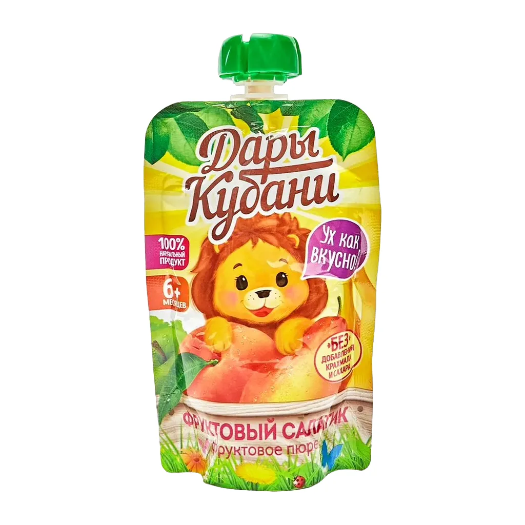 Детское фруктовое пюре из бананов, груш, яблок и персиков Дары Кубани - натуральный продукт для питания детей старше 6 месяцев. Без сахара, без консервантов, без ГМО, без красителей и искусственных добавок. Для производства детского пюре «фруктовый салатик» используются тщательно отобранные яблоки, бананы, груши и персики. На предприятии ведется строгий контроль на всех этапах. Детское пюре фруктовое имеет высокий стандарт качества и сертифицировано по системе эко-продукт. Детское пюре без сахара вкусная и полезная еда для Вашего ребенка. Пюре с яблоком, бананом, грушей и персиком содержит полезные пищевые волокна, яблочный пектин, витамины, фруктовые природные сахара и минеральные вещества – калий. Детское питание Дары Кубани непременно оценит малыш, мама, папа или няня. Упаковка в пауче 90 г надежно сохраняет пользу и вкус пюре. Удобный дой-пак с крышкой можно купить для дома, детского сада, прогулок, школы или путешествия. Дары Кубани для детей раннего возраста - сделано мамами для мам.