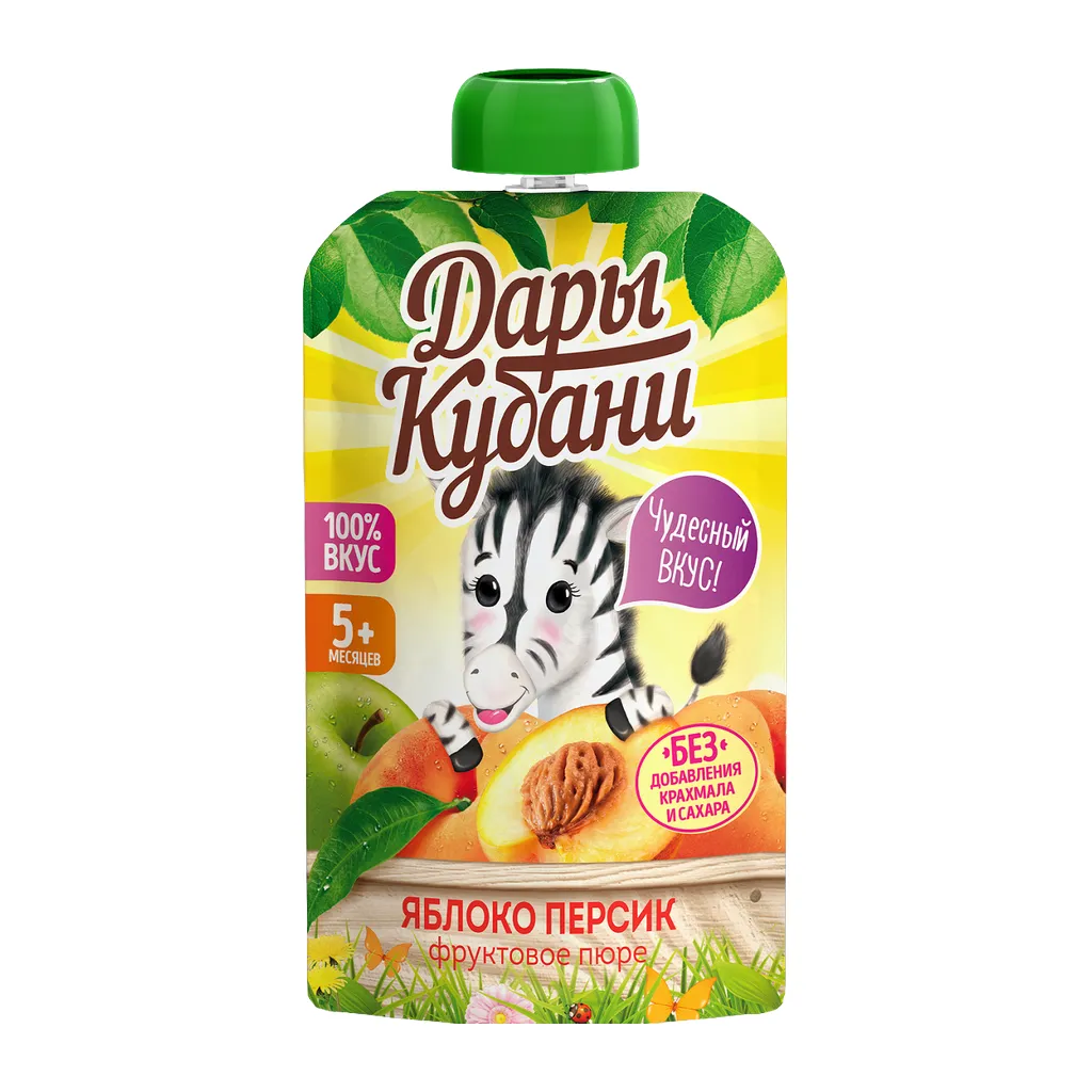 Фруктовое пюре с яблоком и персиком Дары Кубани - натуральный продукт для питания детей старше 5 месяцев. БЕЗ САХАРА, без консервантов, без ГМО, без красителей, крахмала и искусственных добавок. Для производства детского пюре используются тщательно отобранные фрукты - яблоко и персик. На предприятии ведется строгий контроль качества на всех этапах. Детское пюре фруктовое имеет высокий стандарт качества и сертифицировано по системе эко-продукт. Пюре 5 + Яблоко Персик вкусная и полезная еда для Вашего ребенка. Оно содержит полезные пищевые волокна, фруктовые природные сахара и минеральные вещества - калий, кальций. Детское питание Дары Кубани непременно оценит малыш, мама, папа или няня. Упаковка в пауче 90 г надежно сохраняет пользу и вкус. Удобный дой-пак с крышкой можно купить для дома, детского сада, прогулок, школы или путешествия. Мягкая упаковка пауч- это пакетик детского пюре весом 90 г. В одной коробке 12 штук. Детские пюрешки Дары Кубани для детей раннего возраста - сделано мамами для мам.