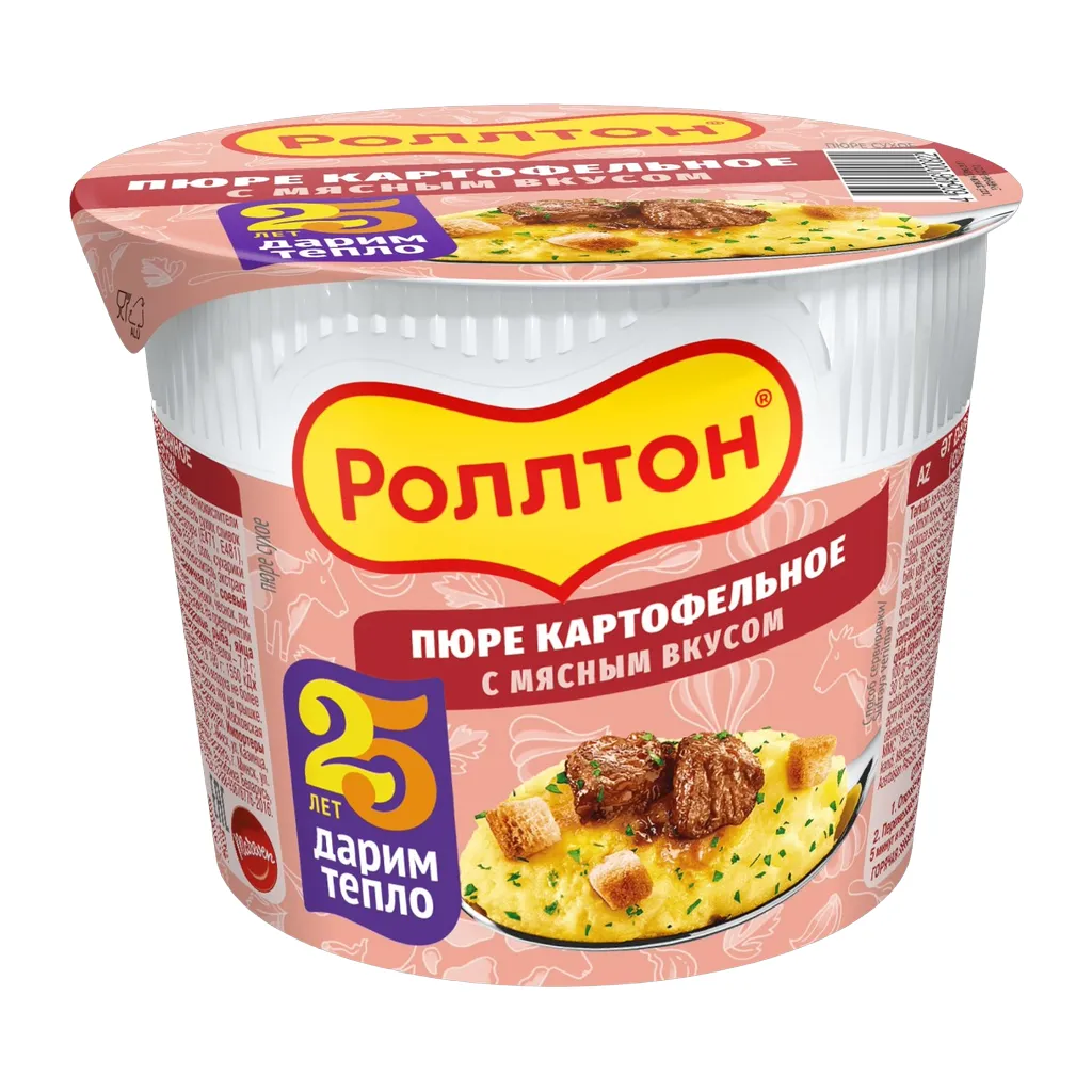 Картофельное пюре от «Роллтон» создано в соответствии с лучшими традициями и вкусовыми предпочтениями потребителей из самых высококачественных ингредиентов. Аппетитное пюре в стаканчике можно приготовить всего за 5 минут. Невероятно быстро при этом сытно и полезно! Кто не любит сочный вкус мяса? А в сочетании с нежнейшим картофелем пюре с добавлением молока, зелени и сухариков получается настоящее произведение кулинарного искусства.