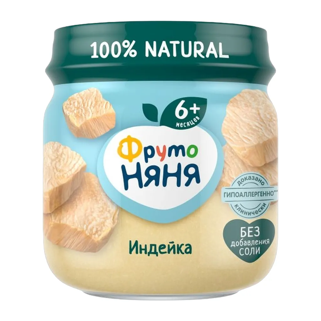 Пюре ФрутоНяня из мяса индейки — отличный способ познакомить малыша с новыми вкусами. В этом вкусном и полезном продукте чистый состав без консервантов, ароматизаторов, красителей и даже соли. Такое детское питание идеально подходит для первого мясного прикорма, а натуральные белки и незаменимые аминокислоты, которые содержит мясо индейки, будут способствовать активному и здоровому росту малыша.
