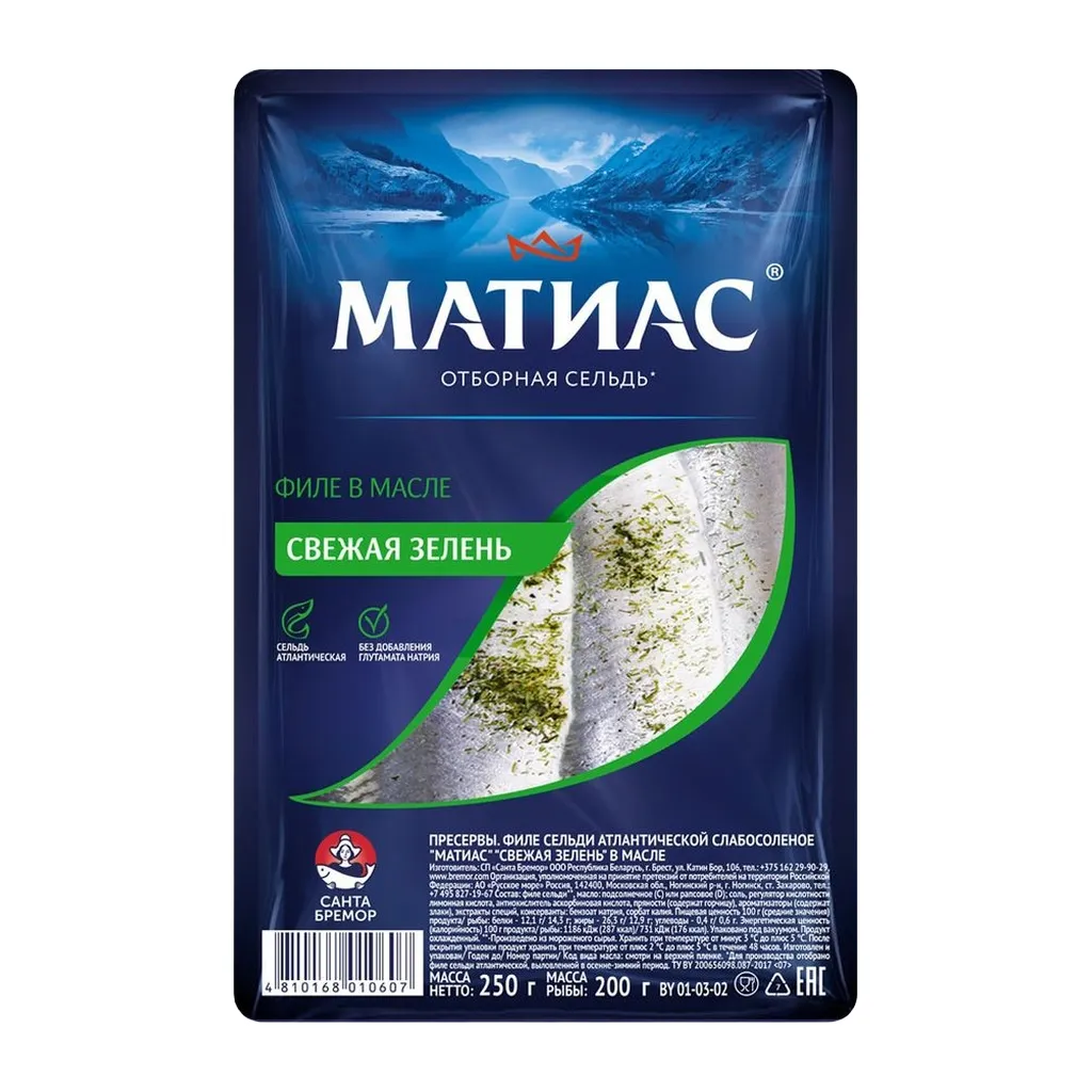 Филе сельди "Матиас" свежая зелень. Производится из атлантической сельди, выловленной в чистейших прибрежных водах Норвегии. «Матиас» - сельдь в лучшем виде:●нежное филе без костей ●крупный размерный ряд ●филе богато жирными кислотами Омега-3 ●не содержит глутамат натрия