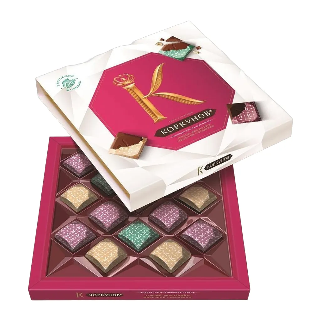 Коркунов «Коллекция шоколадных плиток» с ореховым кремом и миндалём, 131 г. Молочный шоколад с начинкой из орехового крема (10 шт.) и молочный шоколад с миндалем (5 шт.).