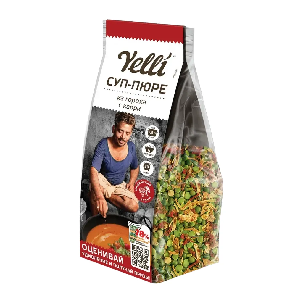 Супы-пюре из гороха готовят в Европе, Азии и Америке – везде со своей «изюминкой». Гороховый суп-пюре с карри – это оригинальное южноазиатское блюдо, сочетающее нежный сладковатый вкус зеленого гороха со знаменитой индийской смесью пряностей.Гороховый суп-пюре с карри от бренда Yelli – это 100% натуральный продукт без соли и ГМО, который подходит для всех приверженцев правильного, здорового питания, веганов и вегетарианцев, его можно добавить в постное и диетическое меню. Он не нуждается в замачивании и невероятно прост в приготовлении. Достаточно вскипятить в кастрюле воду или бульон, засыпать смесь и варить на медленном огне с закрытой крышкой приблизительно 50 минут, чтобы горошек стал мягким. Затем добавить соль по вкусу. Пюреобразная консистенция готовому блюду придается с помощью блендера. Если суп получился слишком густой, можно добавить воды или бульона. Украсьте готовый суп-пюре зеленью и ароматное согревающее первое блюдо готово! Также можно из смеси приготовить гороховую кашу, ведь ее применение не ограничивается только варкой супа. Проявляйте фантазию и открывайте новые вкусы! Пообедать таким блюдом одновременно вкусно и полезно. В его составе бобового супа исключительно натуральные приправы и овощи, включая чеснок, томаты, молотый перец чили, тыкву, репчатый лук и паприку. Набор для приготовления горохового супа-пюре с карри от бренда Yelliстанет отличной подарочной идеей.