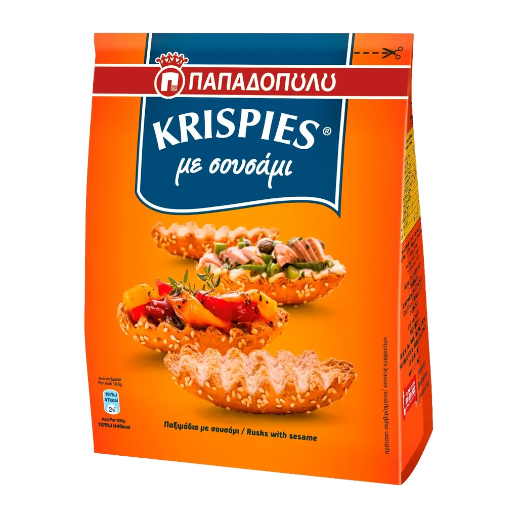Традиционные греческие сухарики Krispies от знаменитого бренда Papadopoulos — это хрустящее лакомство с пикантным вкусом кунжута. Изготовленные по старинным рецептам, они сохраняют аутентичный средиземноморский колорит и дарят неповторимые вкусовые ощущения. Нежные, воздушные кусочки, покрытые ароматными семенами кунжута, создают идеальное сочетание текстур и вкусов.