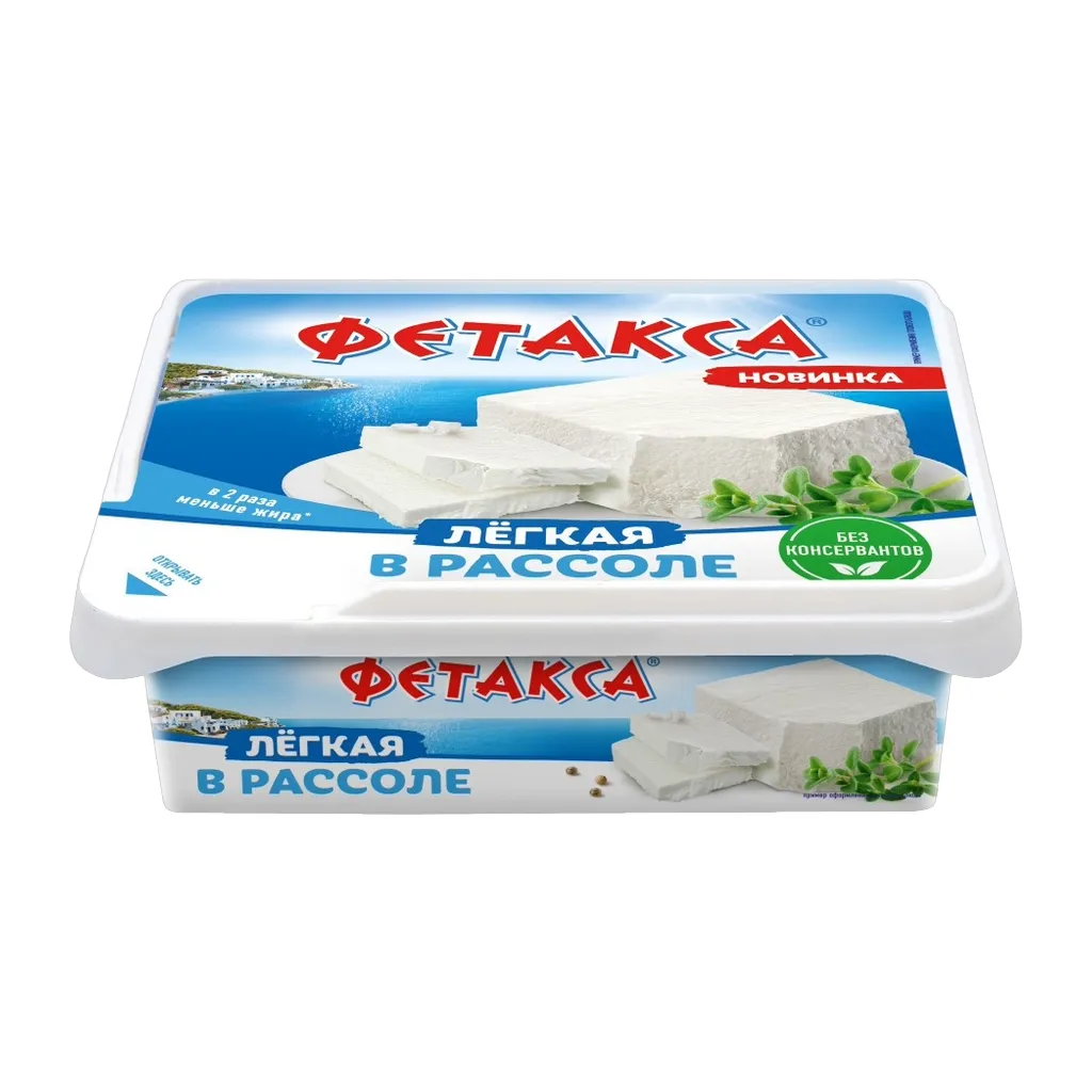 Сыр Фетакса – давно полюбившийся потребителям продукт с греческим настроением.Фетакса обладает неповторимым сливочным вкусом, который сделает ваше блюдо еще вкуснее и оригинальнее. Из традиционного рецепта сыра фета мы взяли все лучшее и воплотили это в две продуктовые линейки бренда Фетакса: В рассоле и Без рассола. Фетакса Легкая в рассоле, 200 г - идеальный выбор для здорового питания без компромиссов в отношении вкуса и пользы. Этот мягкий, слабосоленый сыр обладает нежной консистенцией, сбалансированным кисломолочным вкусом и содержит вдвое меньше жира, чем классическая Фетакса в рассоле. Сыр легко разминается и крошится, что делает его универсальным ингредиентом для салатов, горячих и холодных блюд, пасты и выпечки. Прекрасно сочетается со свежими овощами и зеленью.Фетакса Легкая отличается натуральным составом: только молоко, фермент, закваска и немного соли для придания идеального вкуса.Фетакса производится без использования консервантов и растительных жиров, а еще все продукты Фетакса выпускаются в практичной упаковке, которая позволяет удобно хранить и использовать продукт. С Фетакса все вкусней!