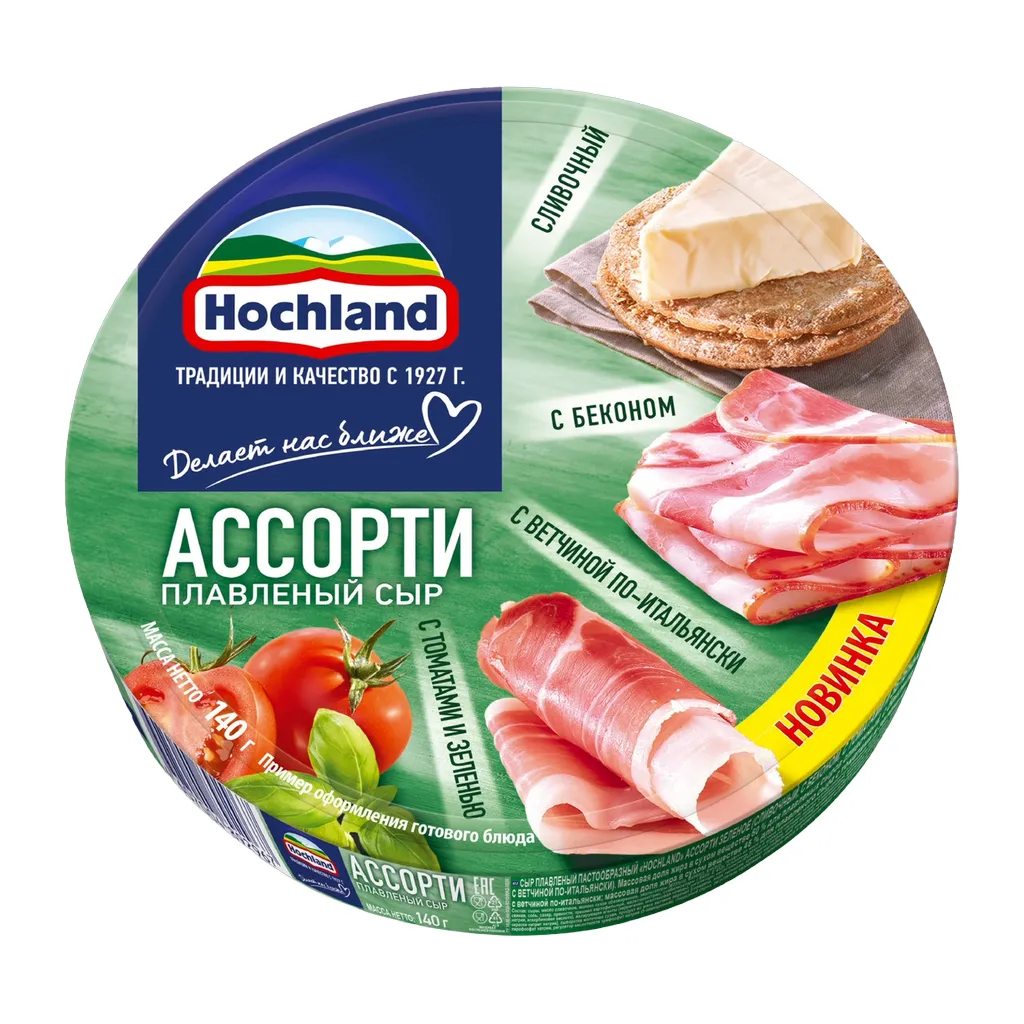 Новое зеленое ассорти плавленого сыра Hochland – это целых четыре вкуса в одной упаковке, которую очень удобно взять с собой! Такое ассорти непременно удивит любителей плавленого сыра новыми уникальными вкусами: сочетанием нежного сыра с деликатесной ветчиной по-итальянски, с ароматной зеленью и томатами, а также порадует любимым сливочным вкусом и ярким вкусом с беконом.