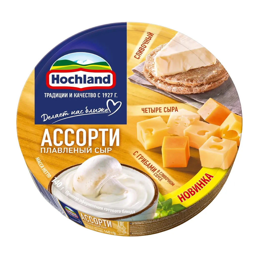 Новое желтое ассорти плавленого сыра Hochland сочетает в себе три ярких, но в то же время классических вкуса. В него входят: изысканный вкус четыре сыра из популярных видовых сыров, новый уникальный вкус с грибами в сливочном соусе и любимый всеми сливочный вкус. Все они сделаны из натурального сыра и объединены в ярком собрании вкусов в одной коробочке, которую так удобно взять с собой.