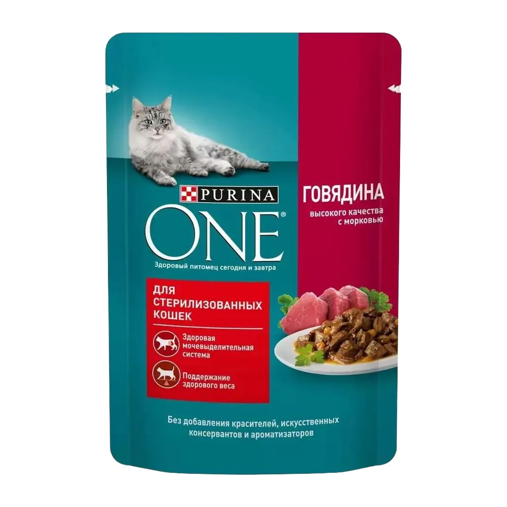 Влажные корма для кошек Purina ONE, разработанные экспертами Purina с учетом потребностей животных после стерилизации, поддерживает здоровый обмен веществ и оптимальный вес питомца.