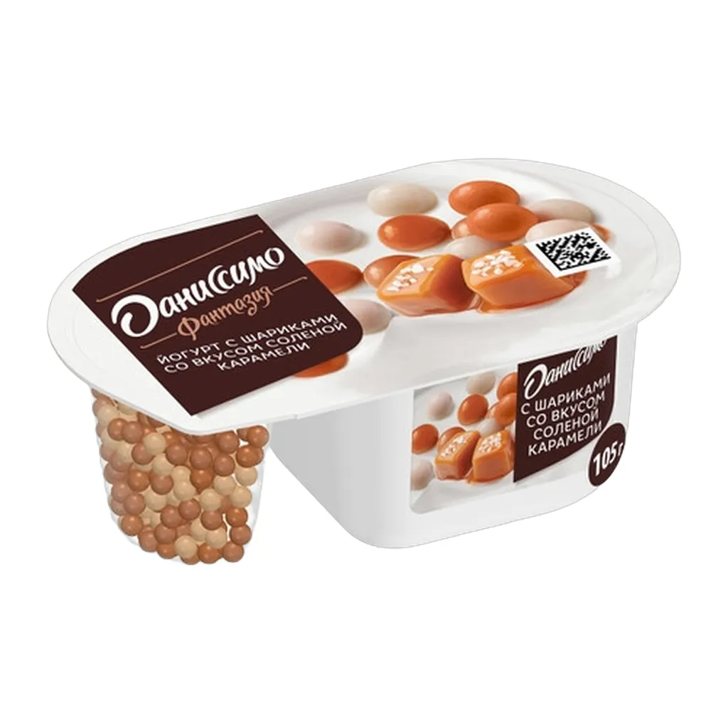Йогурт ДАНИССИМО Фантазия с хрустящими шариками соленой карамели 6.9% 105г