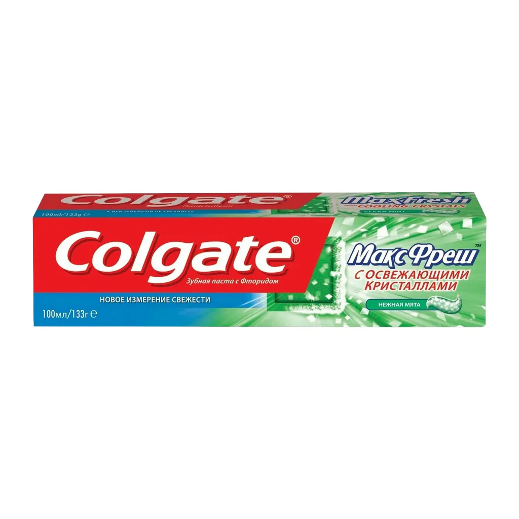 Освежающая зубная паста Colgate Макс Фреш Нежная мята подарит невероятное ощущение свежести для еще большей уверенности в себе! 1. Освежает дыхание — экстраосвежающая формула с передовой технологией интенсивно охлаждает, устраняет неприятный запах и дарит ощущение невероятной свежести. В 10 раз дольше ощущение свежести по сравнению с другими зубными пастами Colgate с фторидом. 2. Помогает бороться с кариесом 3. Приятный вкус мяты Рекомендовано: - для всей семьи - для ежедневного ухода - для профилактики кариеса - для борьбы с неприятным запахом изо рта Текстура: зеленый гель с белыми пластинками. Пластинки растворяются во время чистки зубов. Объем: 100 мл